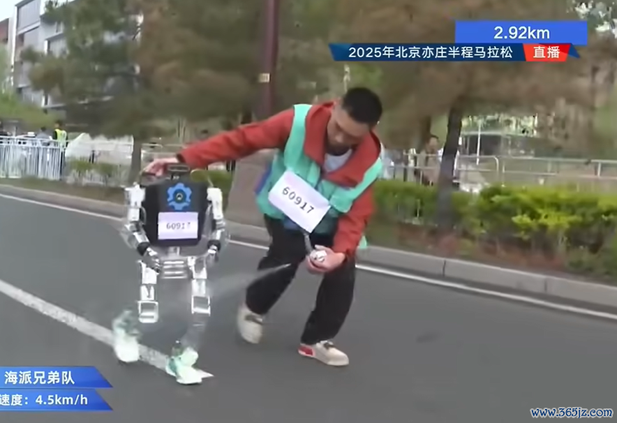首届机器人马拉松,有人跟着机器人一路“手动降温”。