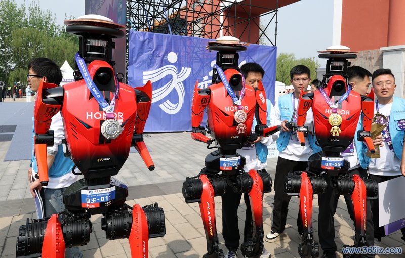 4月19日,人形机器人半程马拉松冠军齐天大圣队自主选手闪电(前右)、亚军雷霆闪电队自主选手闪电(前左)和季军星火燎原队自主选手闪电(前中)在颁奖仪式后合影。\n新华社记者 张晨霖 摄
